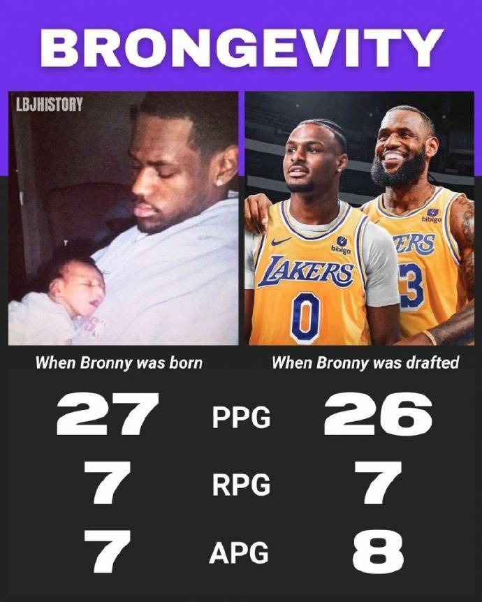 当布朗尼-詹姆斯出生时(2004年),勒布朗场均能拿到27+7+7;而当布朗尼已经参加选秀并进入NBA后,勒布朗场均依然能得到26+7+8。